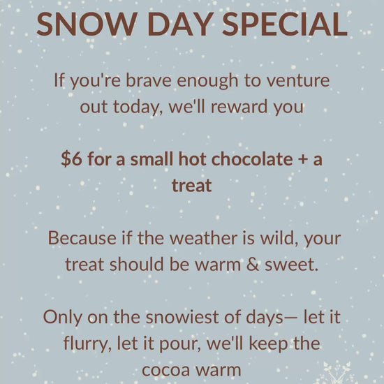 If you're brave enough to venture out, we'll reward you. Because if the weather is wild, your treat should be warm & sweet. Only on the snowiest of days— let it flurry, let it pour, we'll keep the cocoa warm. Check our Instagram to see when this promo is in effect!